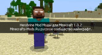 Herobrine Mod Моды для Minecraft 1.3.2 - Забавный, давно известный всем мод для minecraft 1.3.2. После его установки в вашей игре появится ужасающий душу человека зомби, ведь когда он будет к вам приблежатся в ваших жилах будет застывать кровь. Мод очень интересный ведь вы еще многово о нём не знаете, в атаку против херобрина вам будет помогать нотч, ну да у него тоже будет свой друг Чак который будет следить за вами.